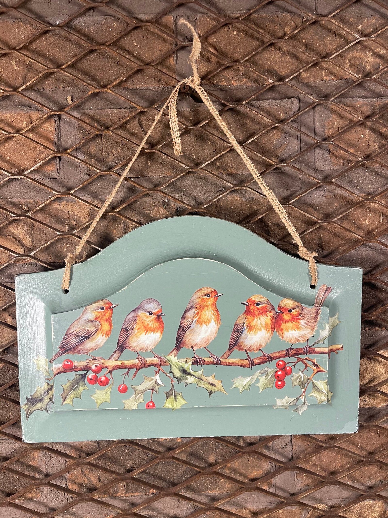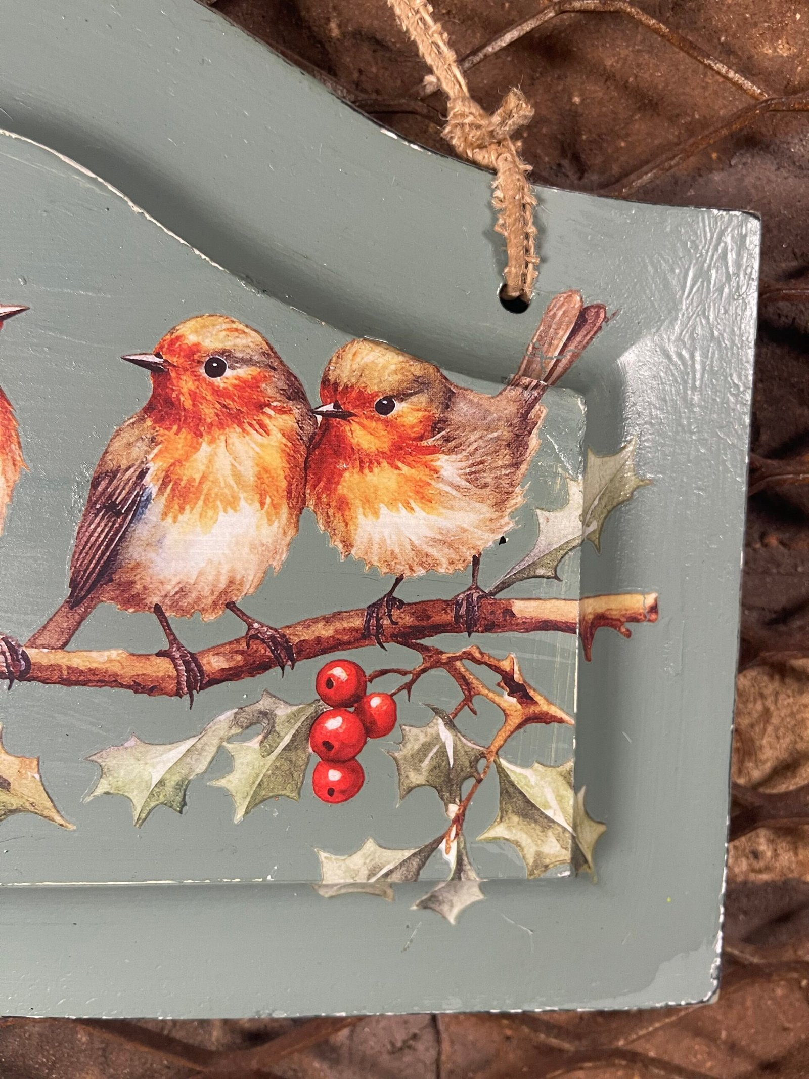 This wooden decor is 12 x 8, is hand-painted and includes an IOD winter bird transfer. It is also sealed. A wonderful transition piece during the winter and throughout the beginning of spring.