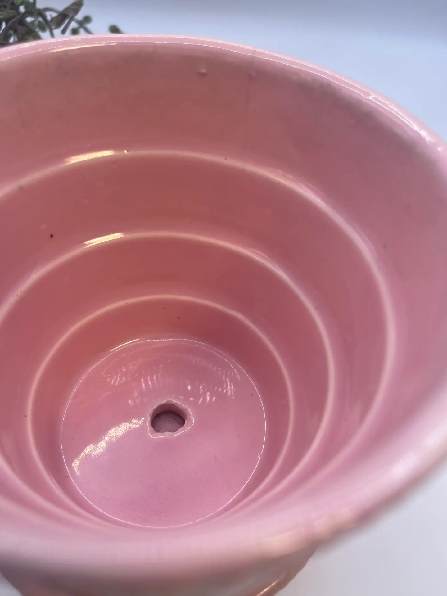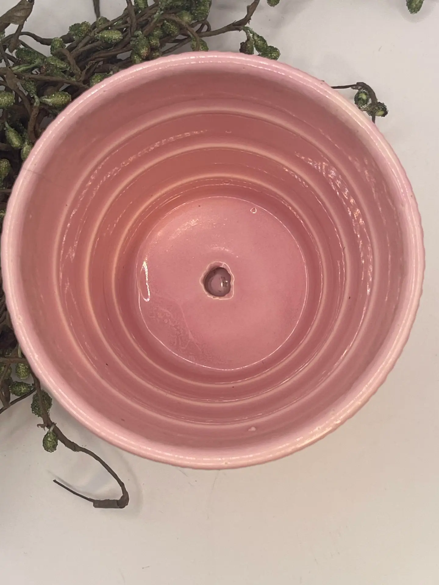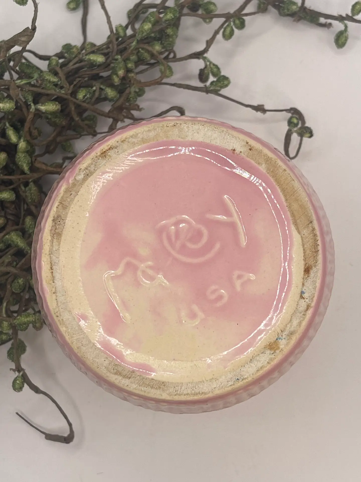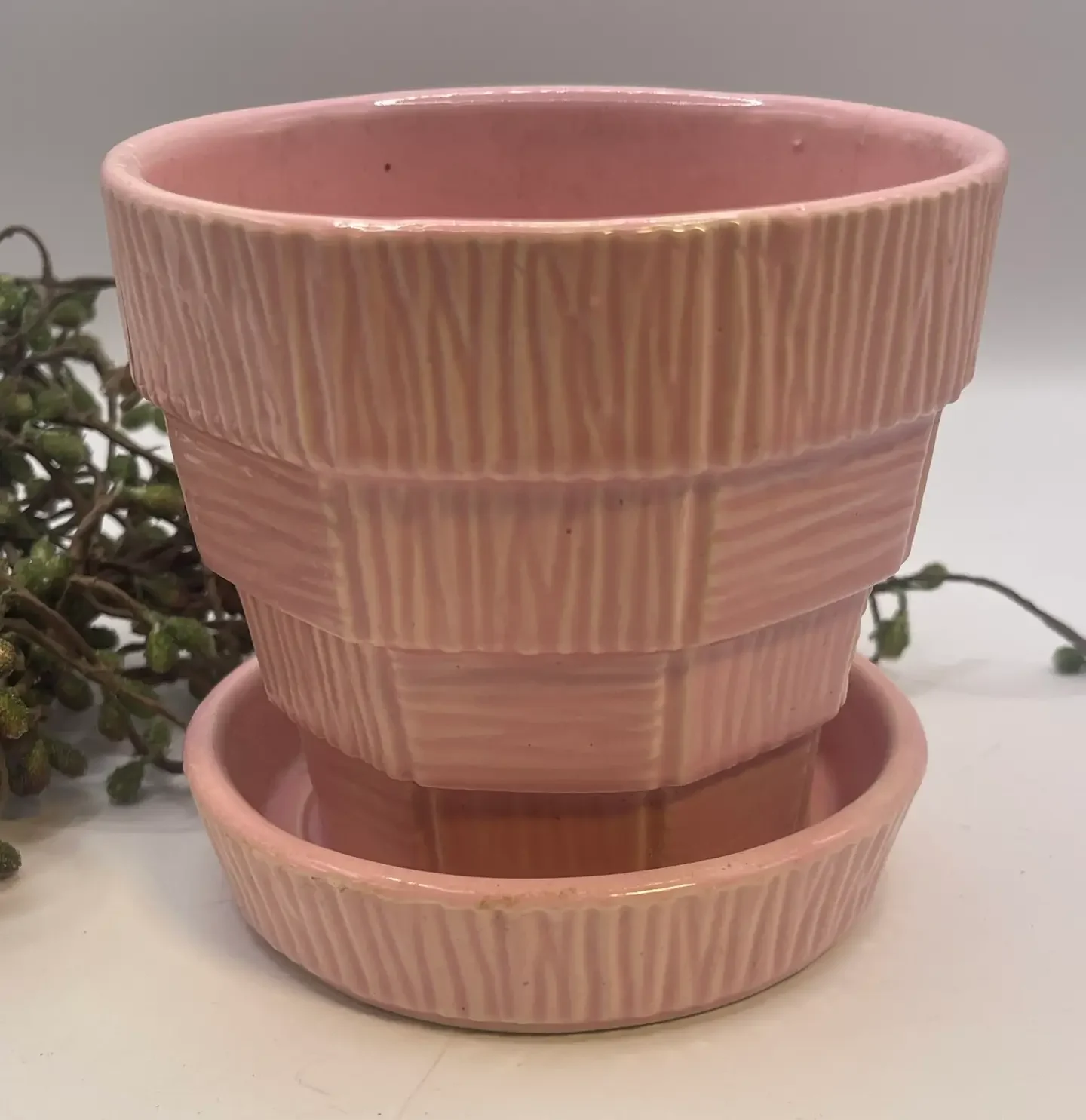 Mid-Century 1940-60s Highly Collectable Pink Glaze Basketweave Ceramic Planter with Attached Underplate Crafted by McCoy Pottery.