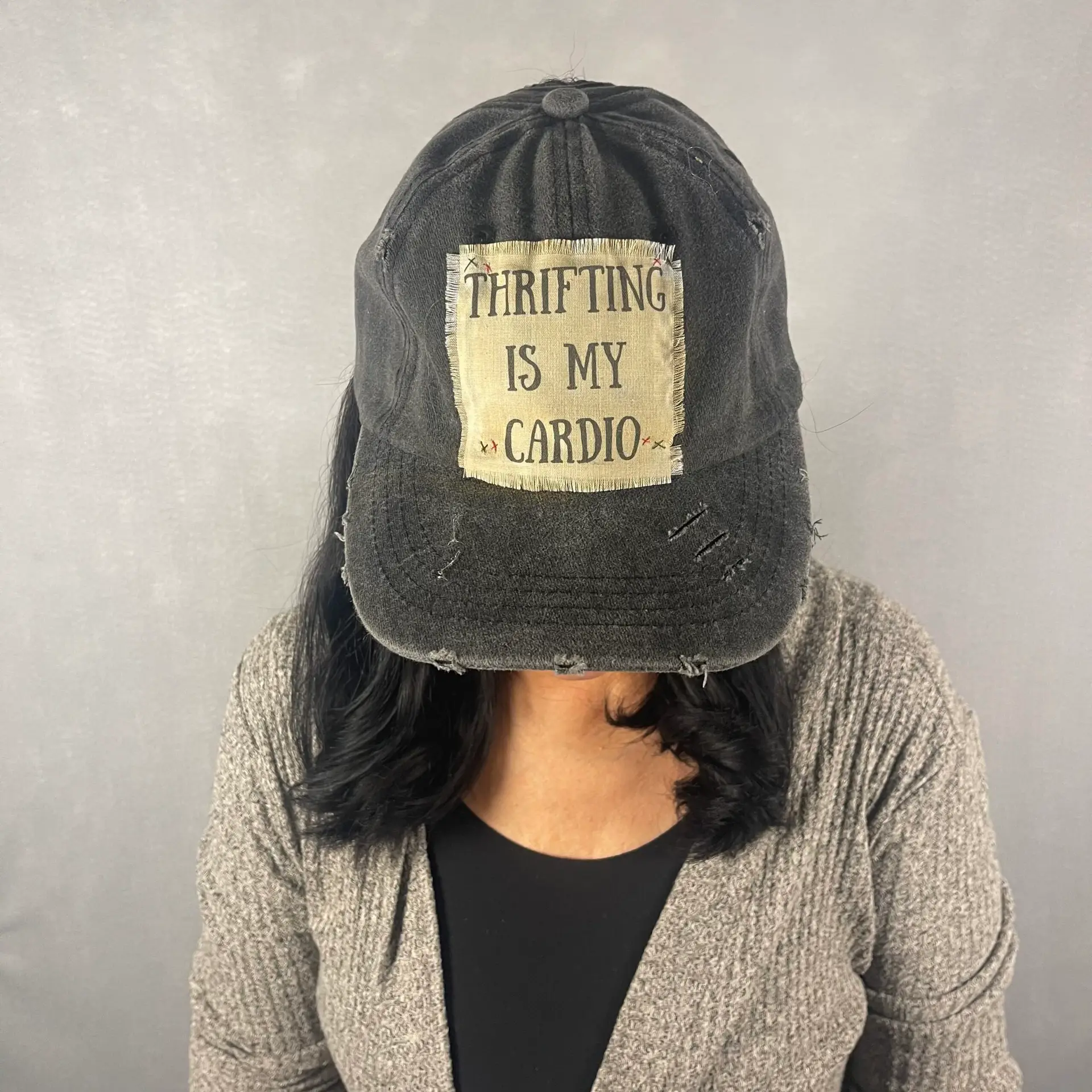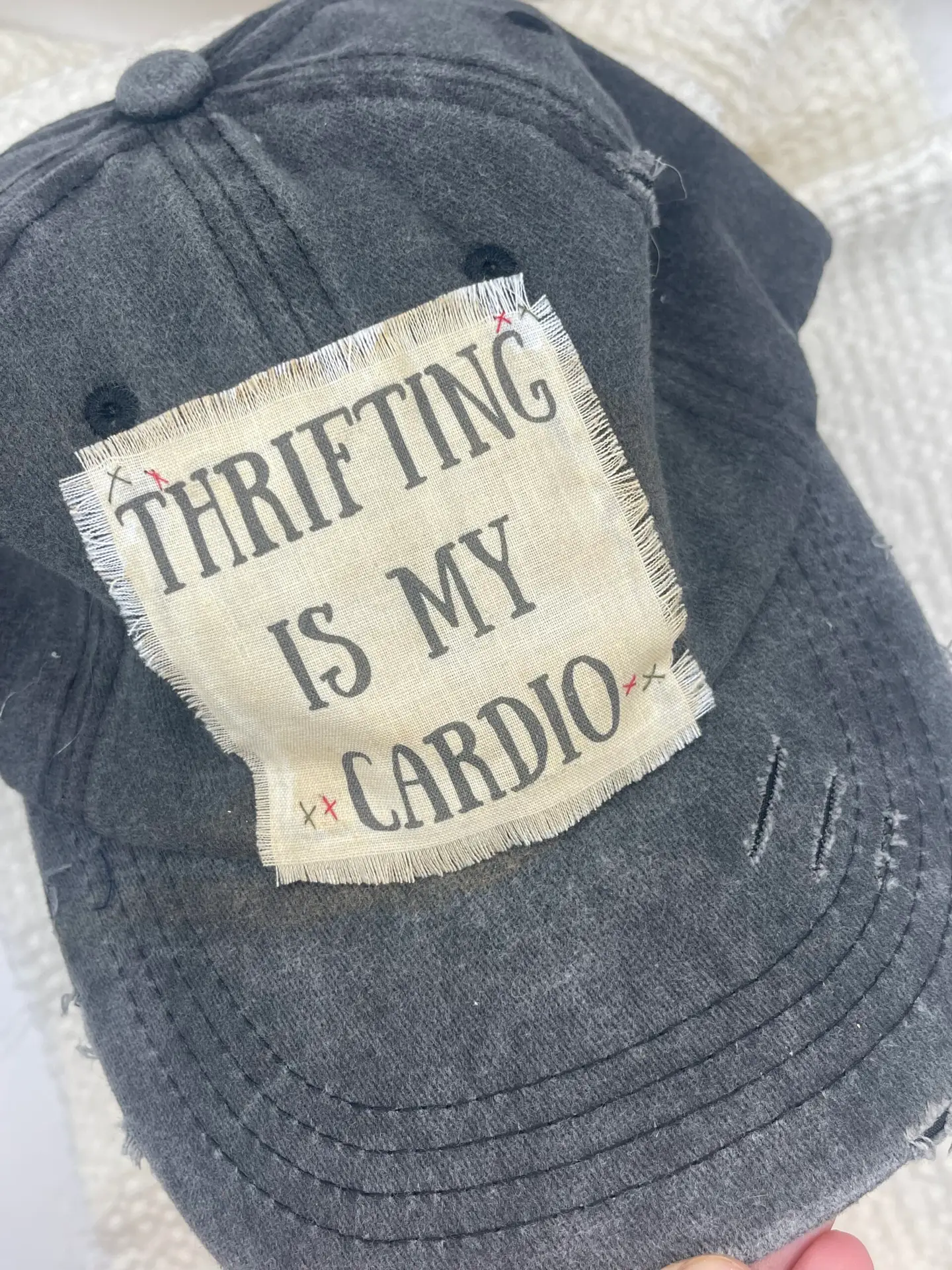 Handmade Details include: Vintage tea-stained fabric that says “Thrifting is My Cardio” Each hat features hand-sewn X details Since each hat is hand-created: colors of thread and placement of Xs will vary from picture